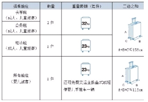 持成人或兒童客票的旅客免費行李額為頭等艙、公務艙兩件行李,每件行李的重量限額為32千克,每件行李的三邊之和不得超過158厘米