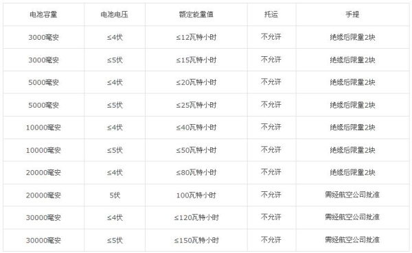 根據國際民航組織《危險物品安全航空運輸技術細則》(2011-2012版)規定,旅客或機組成員為個人自用內含鋰或鋰離子電池芯或電池的便攜式電子裝置(手表、計算器、照相機、手機、手提電腦、便攜式攝像機等)應作為手提行李攜帶登機,并且鋰金屬電池的鋰含量不得超過2克,鋰離子電池的額定能量值不得超過100Wh(瓦特小時),超過100Wh但不超過160Wh的,經航空公司批準后可以裝在交運行李或手提行李中的設備上,超過160Wh的鋰電池嚴禁攜帶。