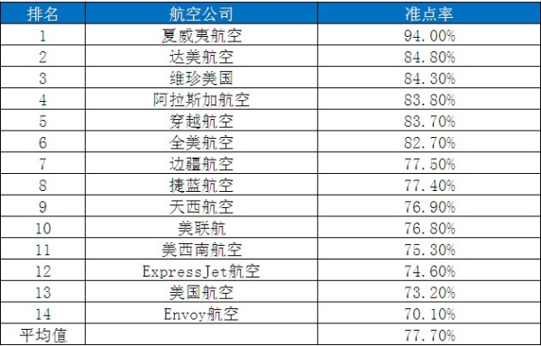 客服熱線 : 8:00-20:00據美聯社報道,10月9日美國運輸部公布了14家航企8月份準點率(計劃時間15分鐘內到達)排名,平均準點率為77.7%,較去年同期的78.8%有所下降,但是優于7月的準點率表現。