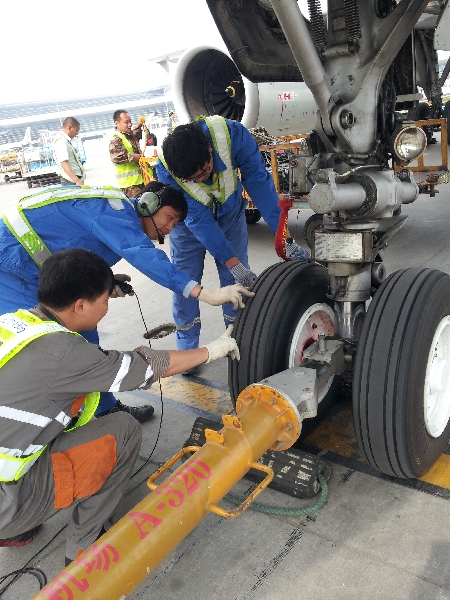 圖:崔彬和同事們在檢查飛機輪胎