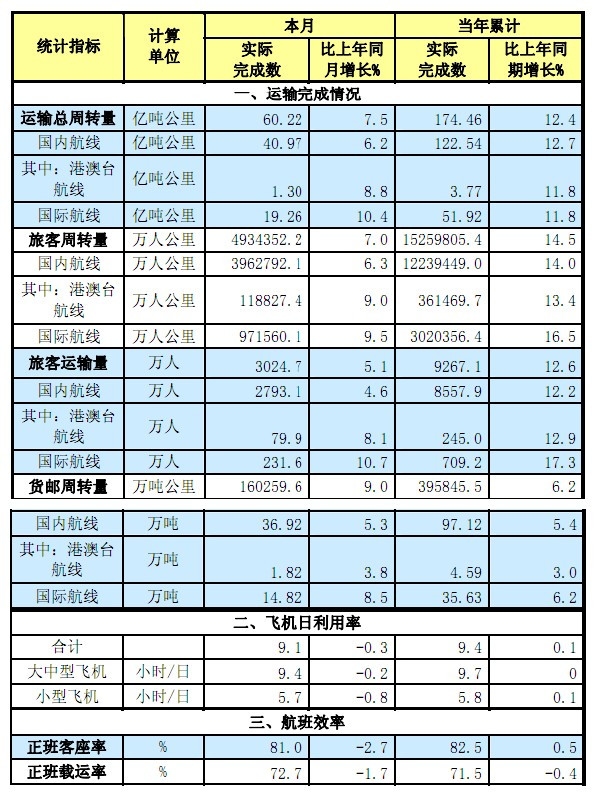 數(shù)據(jù)顯示,今年3月份,中國民航完成旅客運輸量3024.7萬人,同比增長5.1%;完成貨郵運輸量51.73萬噸,同比增長6.2%。正班客座率81%,正班運載率72.7%。